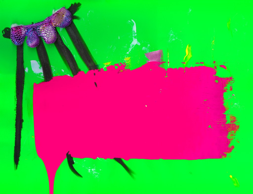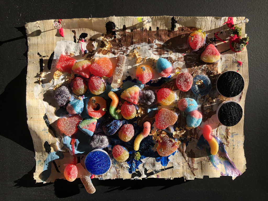 Acrylique, encre, jujubes et mousse artificielle sur carton