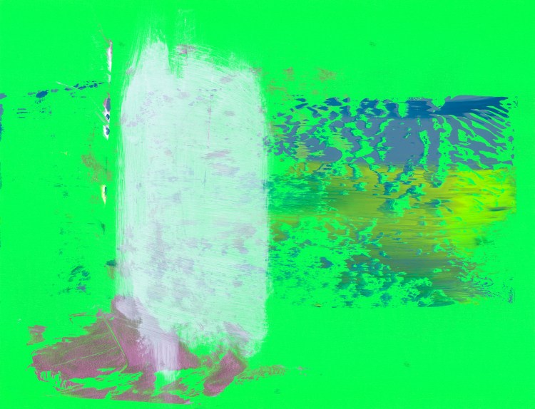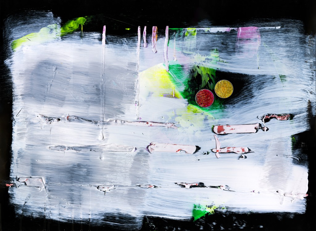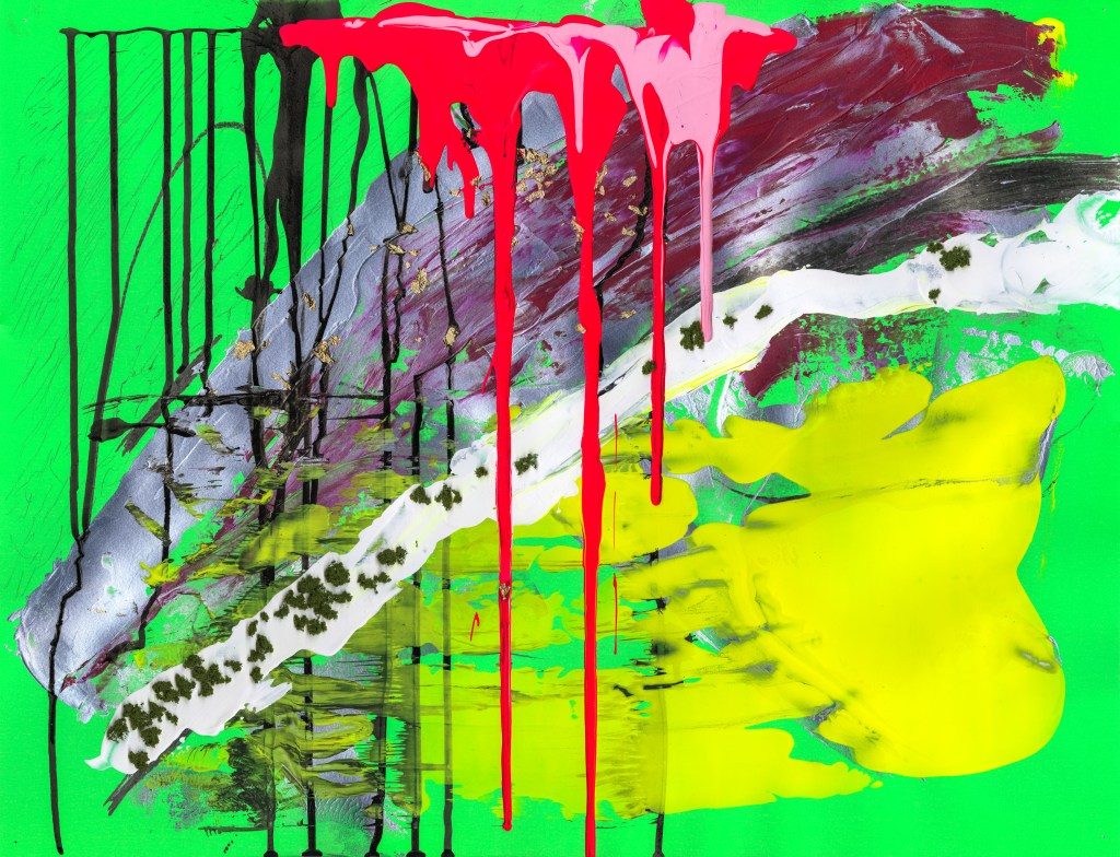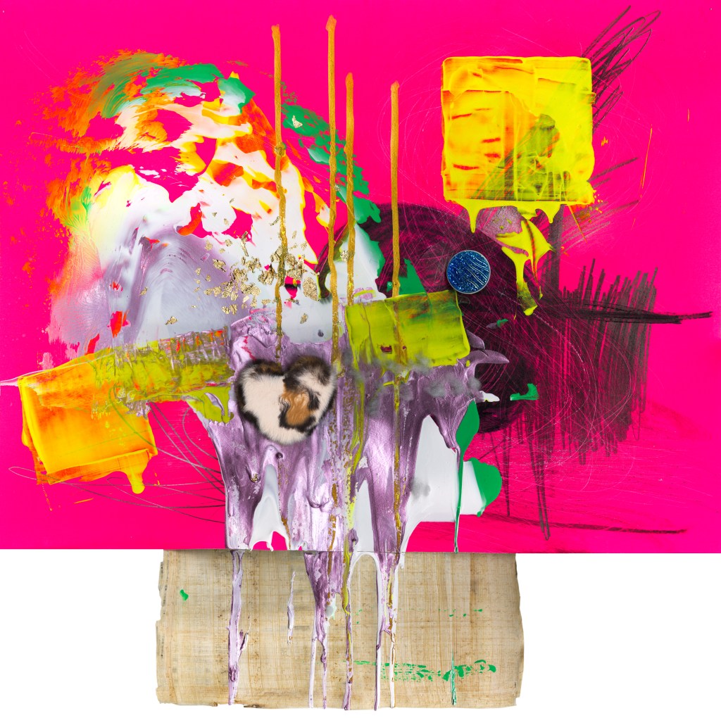 Acrylique, accessoires de portables et gomme Huba Guba sur carton