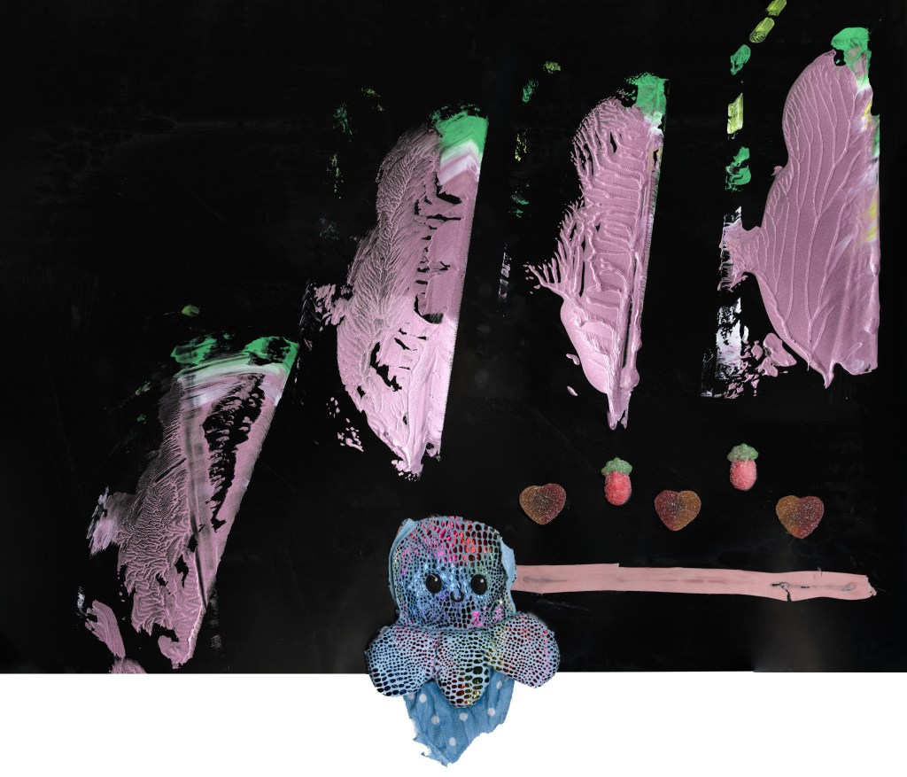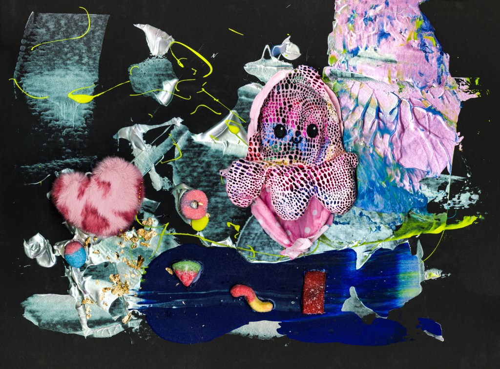 Acrylique, peluches, flocons métalliques et jujubes sur carton